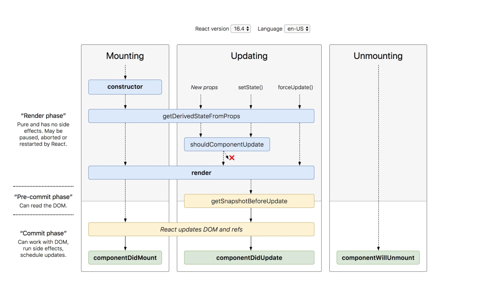 - getDerivedStateFromprops : 이 메서드는 마운트 과정에서도 호출되며, 업데이트가 시작하기 전에도 호출됩니다. props의 변화에