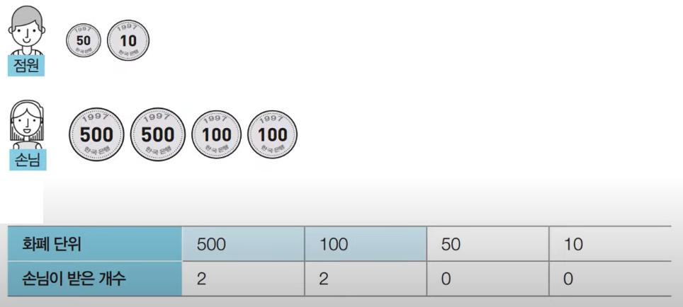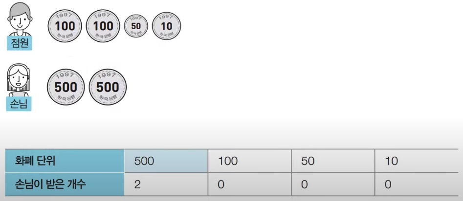 - 최적의 해를 빠르게 구하기 위해서는 가장 큰 화폐 단위부터 돈을 거슬러 주면 됨