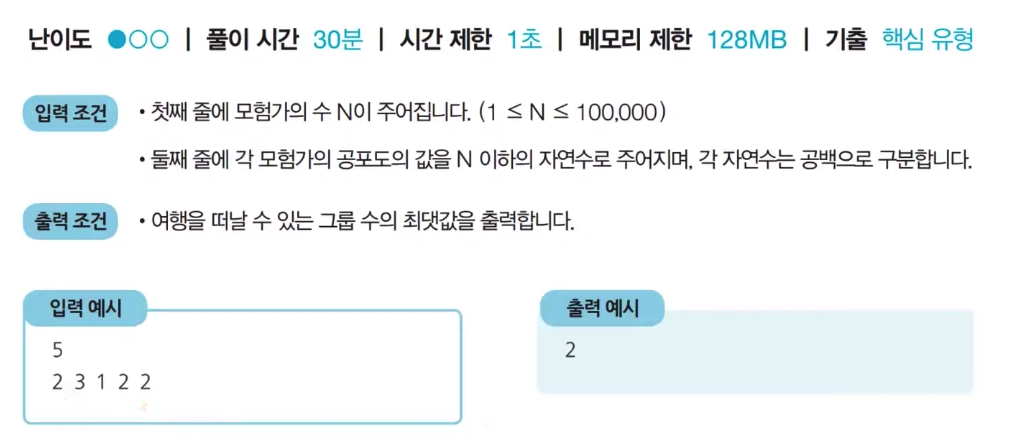 - 그리디 알고리즘 문제에서는 이처럼 문제 풀이를 위한 최소한의 아이디어를 떠올리고 이것이 정당한지 검토할 수 있어야 함