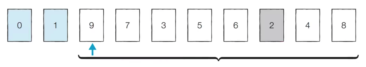 - [Step 2] 처리되지 않은 데이터 중 가장 작은 '2'를 선택해 가장 앞의 '9'와 바꾼다
