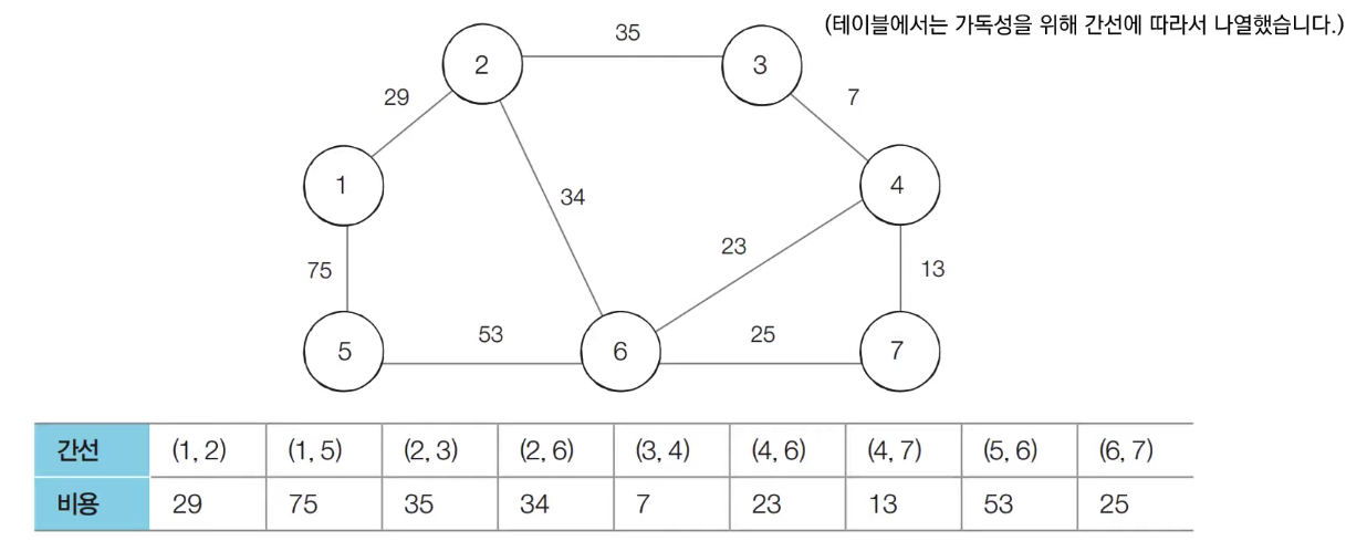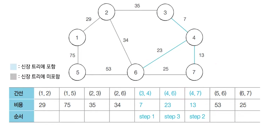 - 크루스칼 알고리즘에서 가장 많은 시간을 요구하는 곳은 간선의 정렬을 수행하는 부분이다