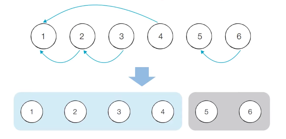 - 서로소 집합 자료구조에서는 연결성을 통해 손쉽게 집합의 형태를 확인할 수 있다