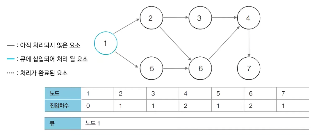 # 처음 시작할 때는 진입차수가 0인 노드를 큐에 삽입