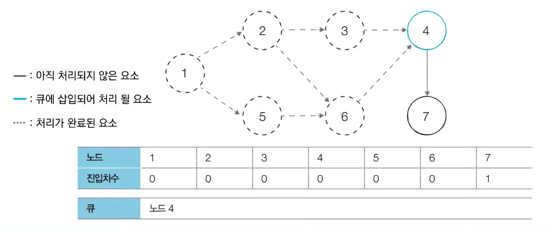 - [Step 6] 큐에서 노드 4를 꺼낸 뒤에 노드 4에서 나가는 간선을 제거한다