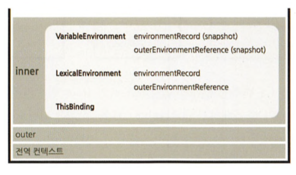 - VariableEnvironment : 현재 컨텍스트 내의 식별자들에 대한 정보 + 외부 환경 정보 선언 시점의 LexicalEnvironment의 스냅샷으로, 변경 사항은 반영되지 않음.
